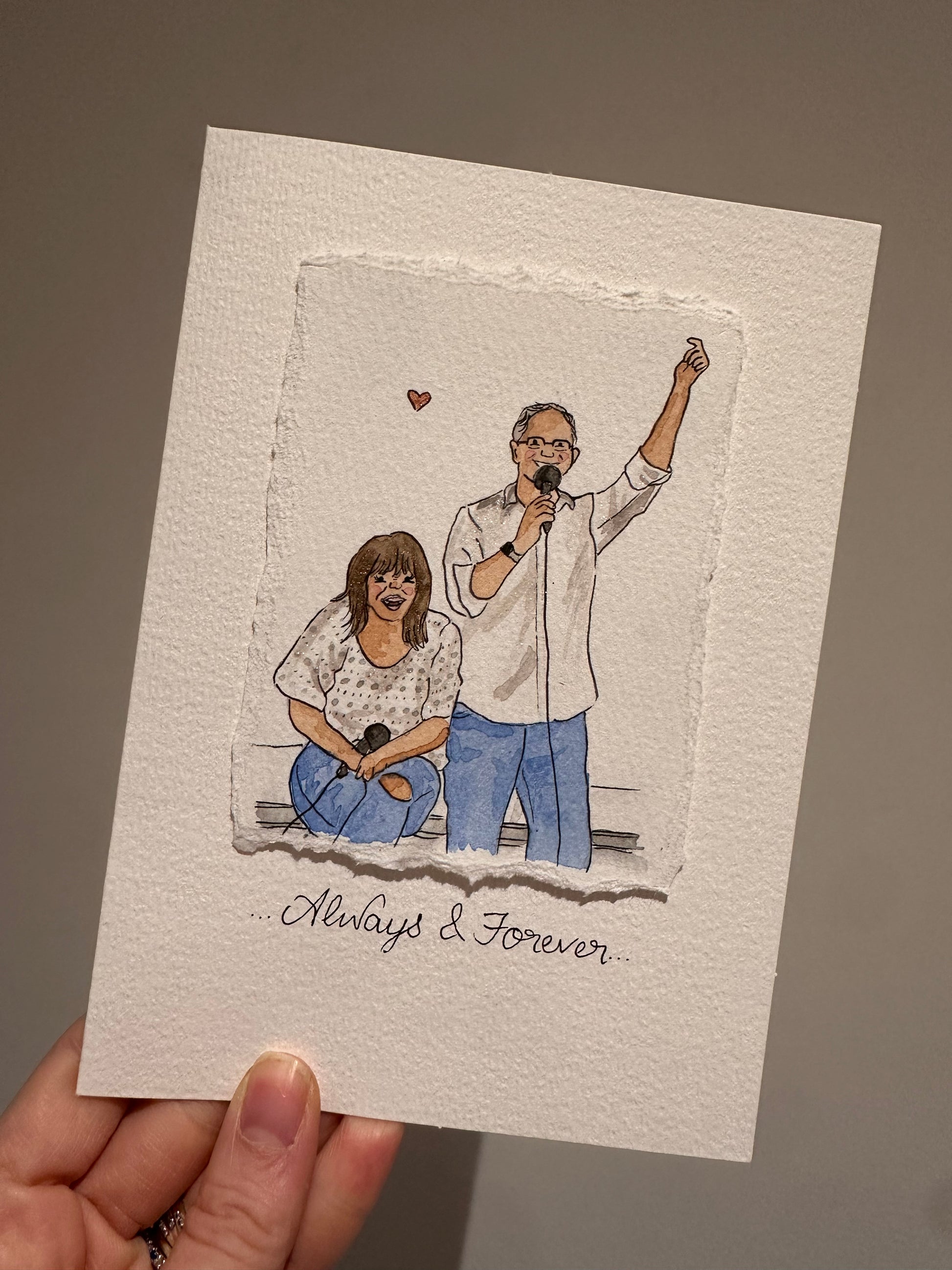 A5 hand-painted cards, featuring a beautiful illustration perfect for an Anniversary. Custom wording can be added either inside the card or beneath the artwork. Each card is carefully wrapped in cellophane.